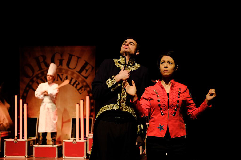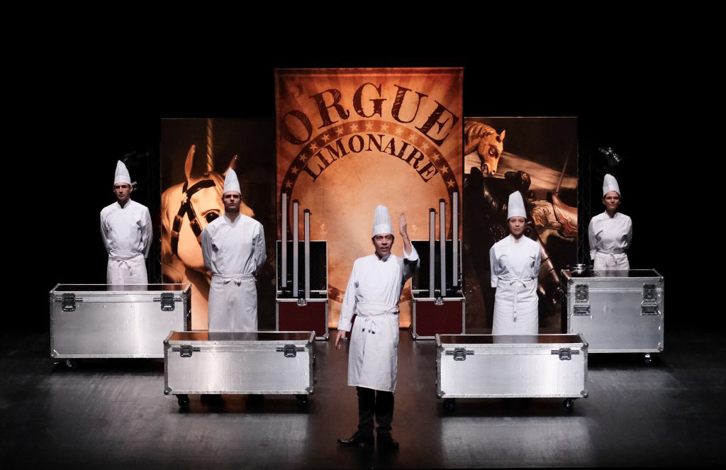 Le rideau s’ouvre donc sur l’immense limonaire qui décore la salle principale de l’Abbaye de Collonges. Immense orgue de barbarie capable de jouer 135 instruments différents et qui forme, dans la grande salle du restaurant, un véritable mur de fond de scène... comme dans un théâtre antique.